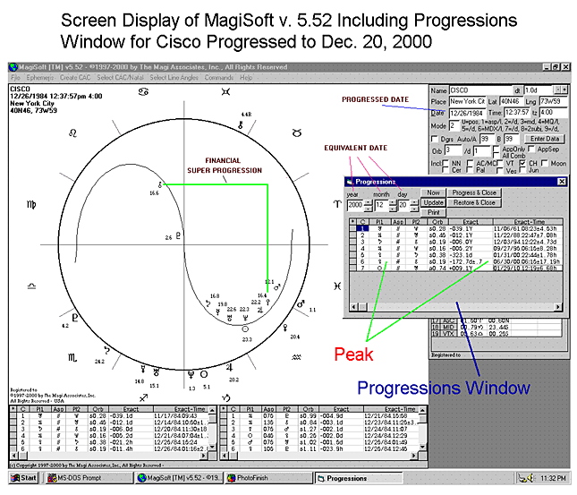 Note well that we used the term WHILE THE PROGRESSION IS APPLYING in the above paragraph. This is because after the Progression is no longer applying, the Progression is no longer working and people no longer are screaming to buy the stock. Because it is so important to know exactly when a Progression ends, the MagiSoft Progressions Upgrade ACTUALLY GIVES YOU THE DATE WHEN EVERY PROGRESSION PEAKS. If you look at the Progressions Window, you will see that the green lines point to where the Venus/Chiron Progression is, and the program gives you the exact day the Progression peaked, which is June 30, 2000. This date is off only a few months and remarkably close to the date that Cisco's stock actually peaked, especially considering that we are talking about a Progression that lasted years.