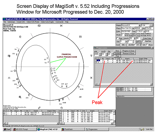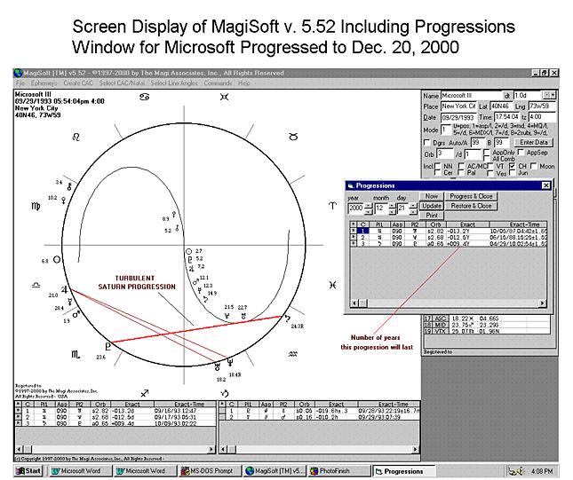 As you can see, Microsoft now has a Turbulent Saturn Progression formed by Saturn being square to Pluto. If you look at the Progressions Window where the red line is, the Progressions Upgrade of the MagiSoft program tells us that the Saturn/Pluto square will last for 9.4 years (9.4Y). That is a long time. Unless Microsoft reincorporates (which it has already done twice), this progression could be a sign that Microsoft's dominance will be badly shaken, even in operating systems.
